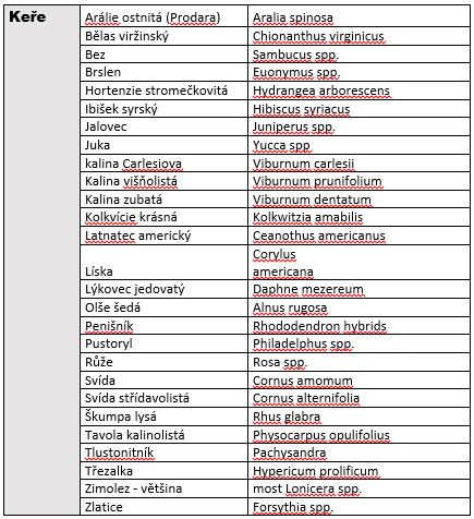 Keře: borůvka, arónie (temnoplodec), skalník, zimolez Maackův, hortenzie, šeřík, ptačí zob, mochna, rododendron, tis a některé druhy kaliny keřové