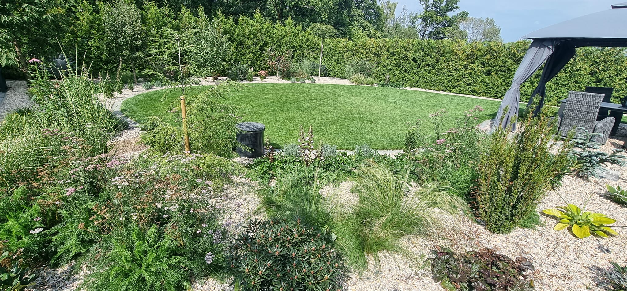 Ladné křivky trávníku udrží zahradu krásnou celoročně